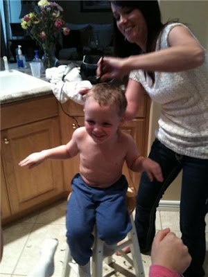 I finally broke down and let them cut Levis hair. I love his long hair but he started to look like a girl so I figured it was time. Aunt Amy cut his hair for us. She did a wonderful job and its hard to cut a 3 year old hair.